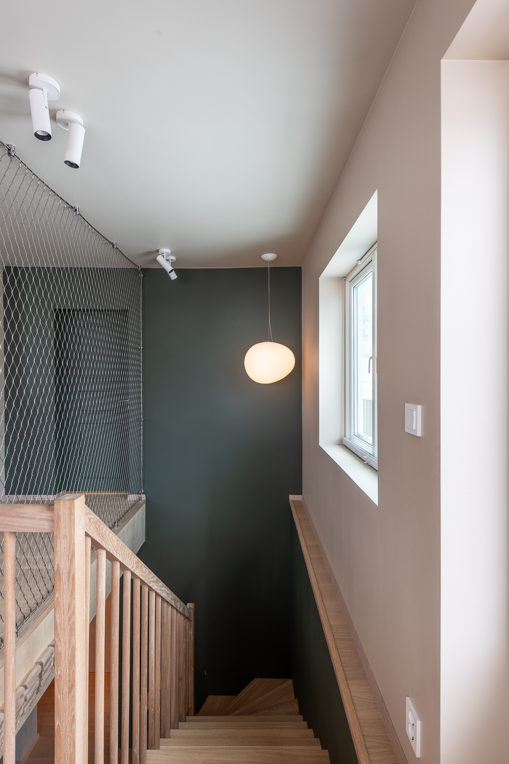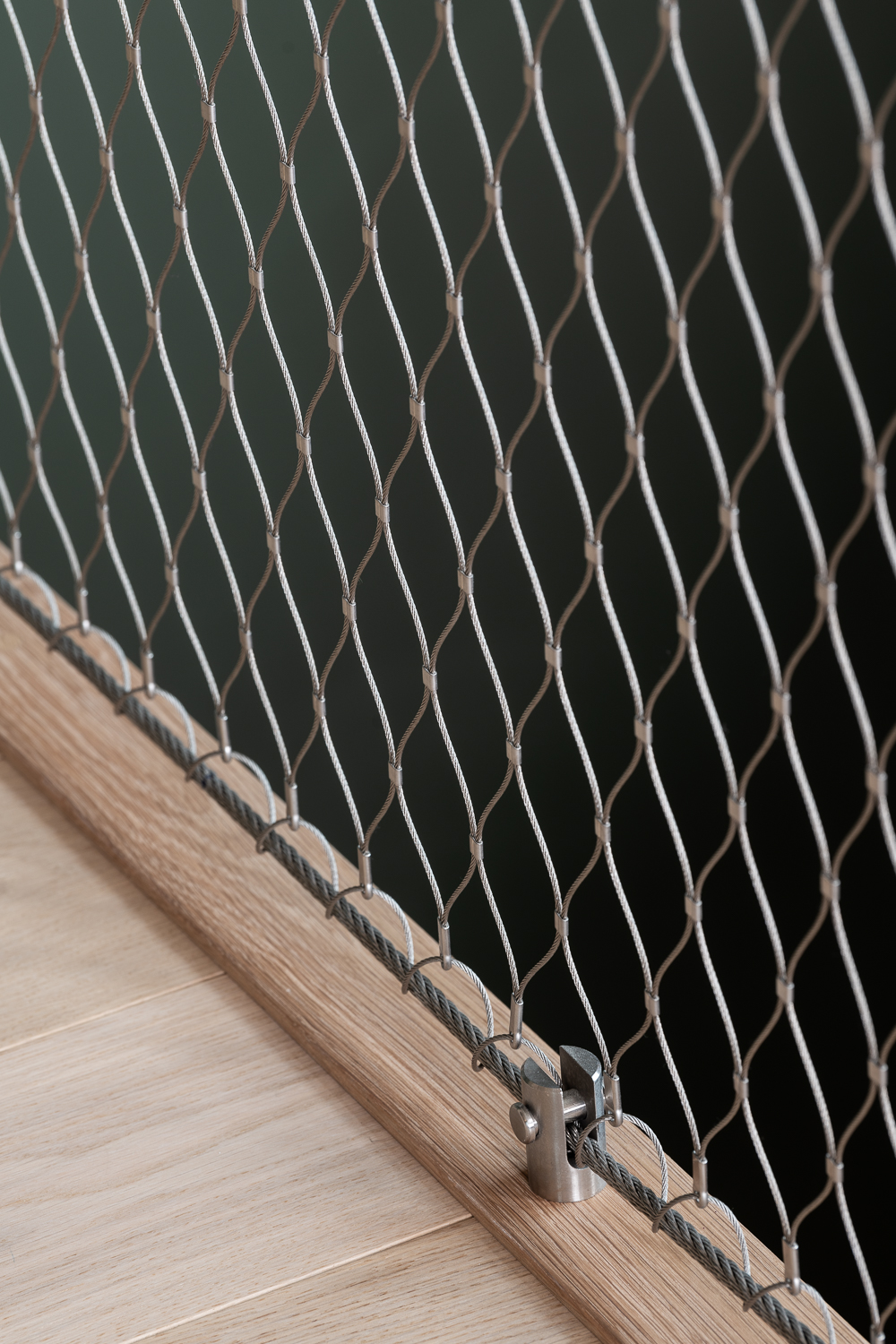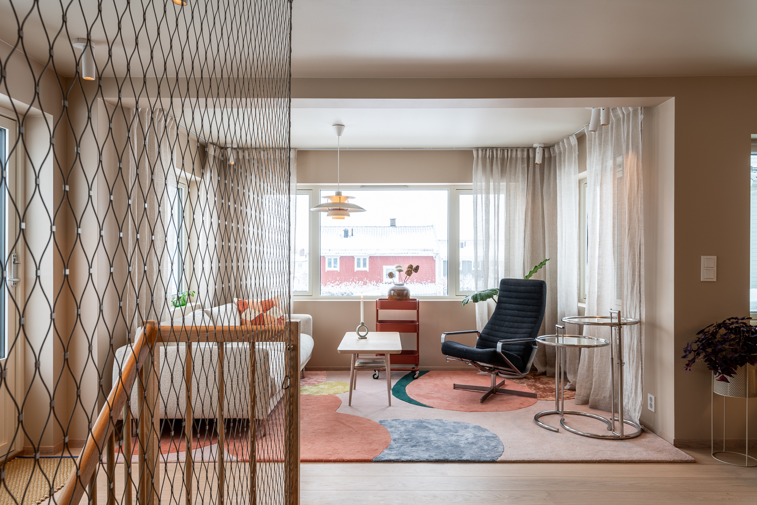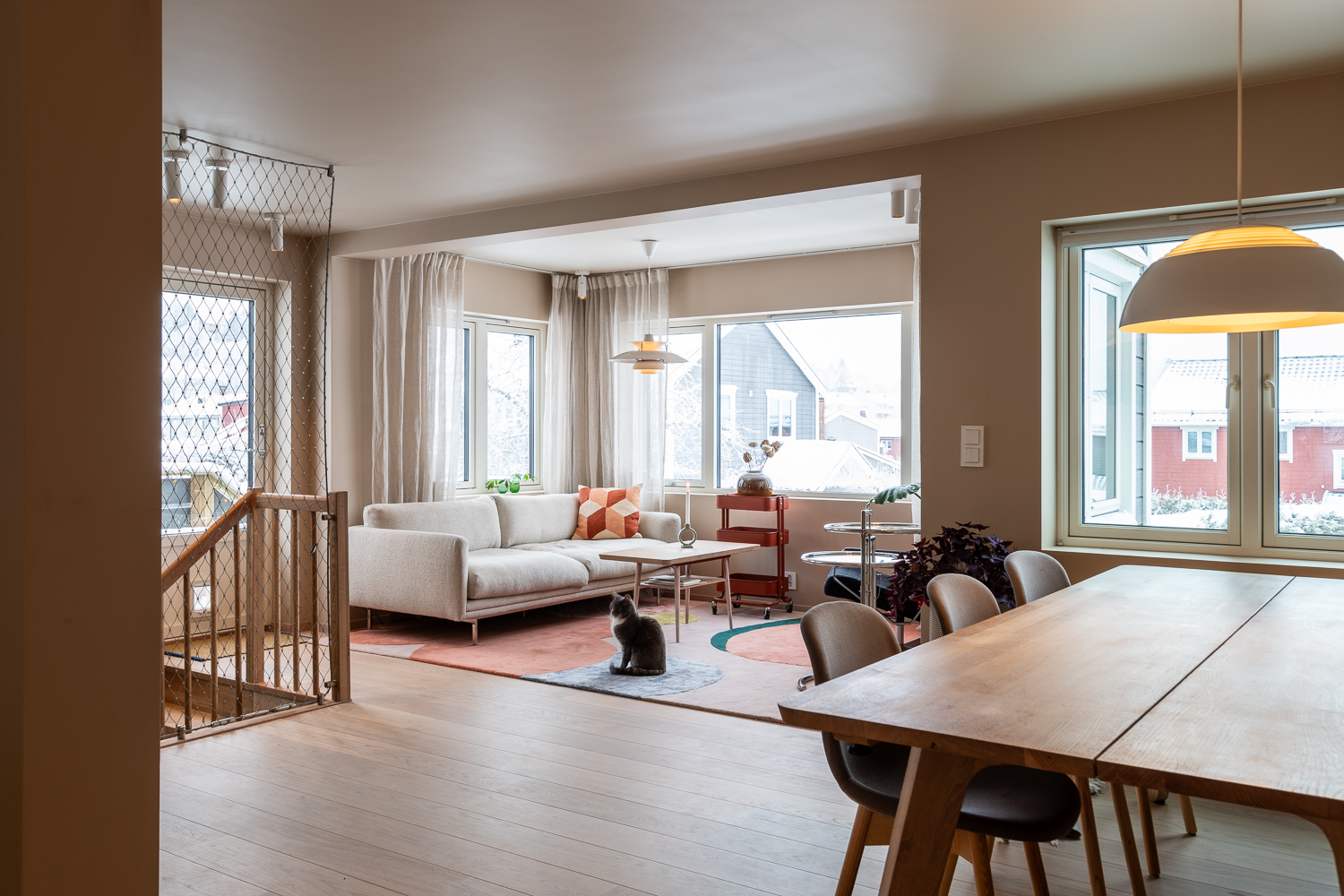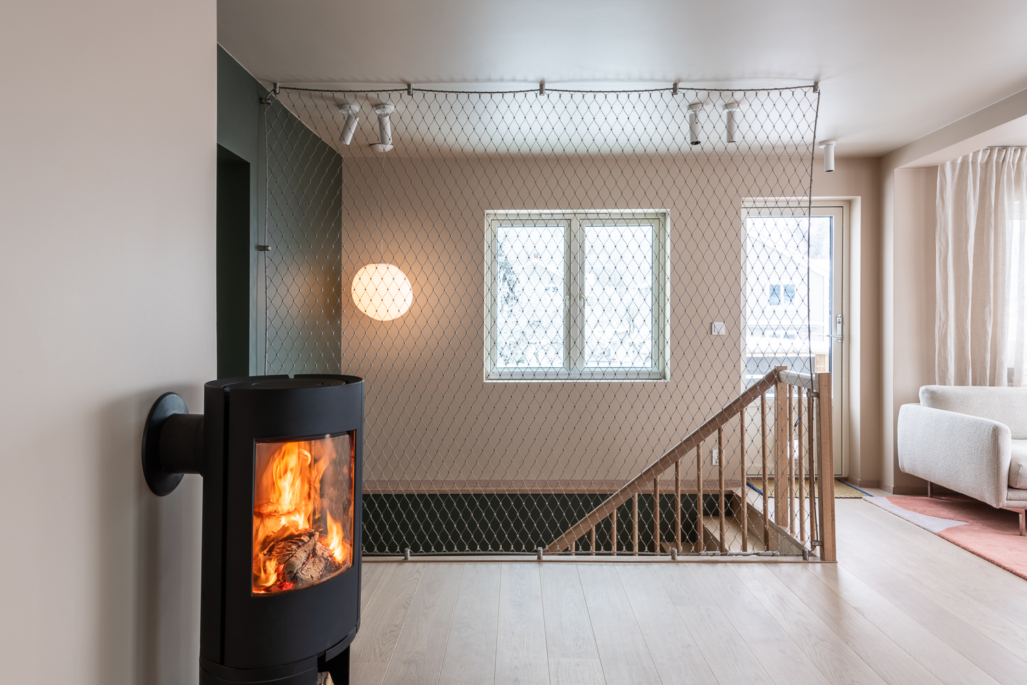 En familiebolig på Årvoll i Oslo er gjennomgående fornyet innvendig. Byggherre ønsket seg en sikker, men luftig og åpen løsning i åpningen mot trappen. Svaret på den utfordringen ble et X-TEND vaiernett i form av et flagg som strekker seg fra gulv til himling.